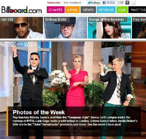 가수 싸이가 팝스타 브리트니 스피어스와 미국 대표 음악전문사이트 빌보드 메인 화면을 장식했다.