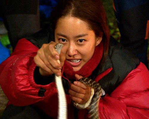 전혜빈이 이번엔 맨손으로 뱀을 잡아 뒤로 숨은 남자들을 경악케했다.