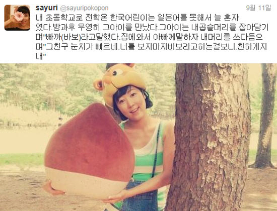 사유리는 지난 11일 자신의 트위터에 초등학교 시절 아버지와의 에피소드를 소개했다. 그는 "내 초등학교로 전학 온 한국어린이는 일본어를 못해서 늘 혼자였다. 방과 후 우연히 그 아이를 만났다. 그 아이는 내 곱슬머리를 잡아당기며 '빠까(바보)'라고 말했다"며 당시의 상황을 '초동학교'(초등학교) '우영히'(우연히) 등의 서투른 한국말로 써내려갔다. 이어 "집에 와서 아빠께 말하자 내 머리를 쓰다듬으며 '그 친구 눈치가 빠르네. 너를 보자마자 바보라고 하는 걸보니. 친하게 지내"라고 말씀하셨다며 아버지와의 유머러스한 추억을 공개해 네티즌들을 폭소케 했다.