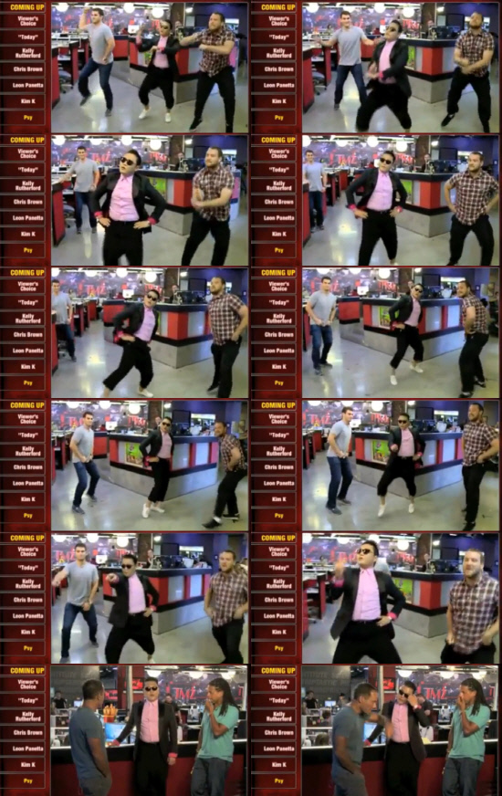 미국 유명 연예매체 TMZ는 12일 공식 홈페이지와 유튜브를 통해 싸이의 방송 출연 영상을 공개했다. 공개된 영상에서 싸이는 스태프에게 '강남스타일'의 '말춤'에 이어 데뷔곡 '새'에서 선보인 코믹 댄스까지 가르쳐줬다. 이에 스태프는 '새춤'을 따라했지만 몸이 마음대로 움직이지 않아 주변을 폭소케 했다.