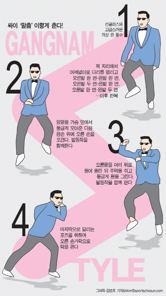 팔동작은 양팔을 가슴 앞에서 둥글게 모아준 다음 왼손 위에 오른 손을 포갠다. 주먹은 가볍게 쥔다. 이 상태로 발동작을 함께 곁들이면 '말춤' 1단계가 완성된다. 말을 타듯 춤을 췄다면, '카우보이 버전'을 연습할 수 있다. 오른팔을 머리 위로 들어 올린 뒤 주먹을 쥐고 둥글게 원을 그리며 발동작을 함께 하는 방법이다. 여기에 "의상은 고급스럽게, 춤은 싼티나게 추는 것이 포인트"라는 싸이의 설명처럼 선글라스와 고급스러운 의상을 장착하면 '말춤' 마스터가 될 수 있다.