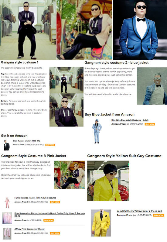 해당 사이트는 '강남스타일' 뮤직비디오에서 싸이가 입고 나온 의상을 상의, 하의, 신발 등으로 나눠 자세하게 분석한 뒤 이 의상들에 대한 설명과 특정 품목을 어디에서 구입할 수 있는지를 자세하게 일러주고 있다.