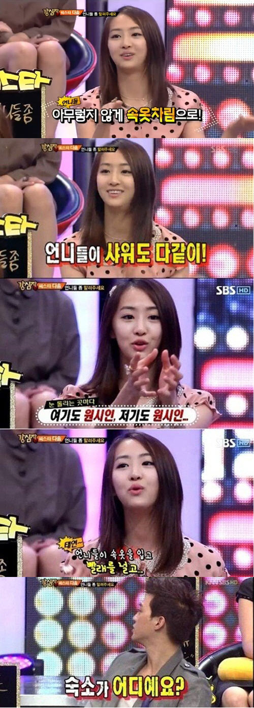 특히 다솜은 "원룸이었던 첫 숙소생활이 힘들었다"며 "저를 제외한 효린 보라 소유 언니들이 속옷만 입은 채 청소하고 빨래를 널었다. 여기도 원시인, 저기도 원시인이 있어 눈을 어디다 둬야 할지 몰랐다. 심지어 샤워도 다 같이 들어가서 씻더라"고 전했다.