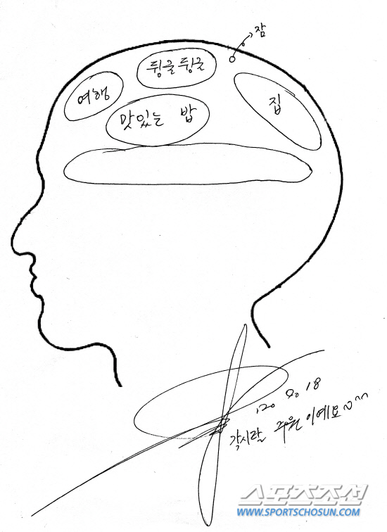 하지만 그가 뇌구조로 택한 단어는 온통 '휴식'과 관련된 단어뿐. '뒹굴뒹굴' '휴식' '여행' '맛있는 밥' '집' 등이다. "요즘엔 스케줄 때문에 그런지 밥도 대충 급하게 먹거든요. 맛있는 밥을 천천히 음미하면서 먹어봤으면 좋겠어요.(웃음)"