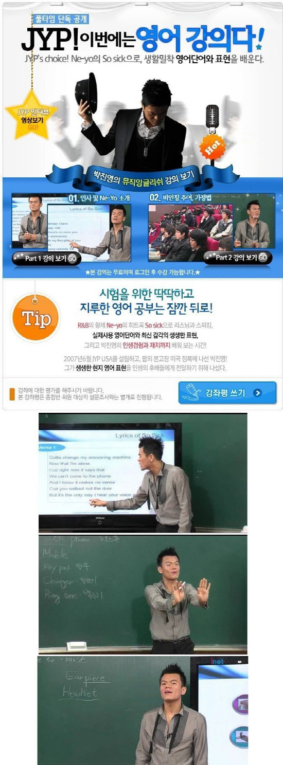 이는 실제로 박진영이 2009년 JYP엔터테인먼트와 전략적 제휴관계를 맺은 인터넷교육업체 아이넷스쿨의 'JYP 뮤직잉글리쉬'라는 강의 중 한 모습이다.