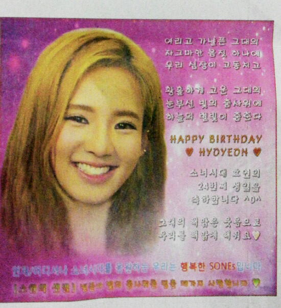 소녀시대 팬카페 '시스터스'가 22일 자사 신문에 광고를 내고 효연의 스물네번째 생일을 축하했다.
