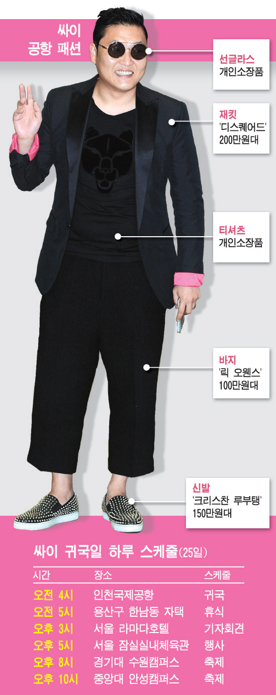 입국장에 들어선 싸이는 올블랙 패션에 깔끔하게 빗어 넘긴 헤어스타일과 트레이드마크가 된 동그란 선글라스를 매치해 눈길을 끌었다. 미국 NBC '엘렌 드제너러스 쇼'에 출연해 브리트니 스피어스에게 '말춤'을 가르쳐주면서 '옷은 클래식하게 춤은 싼티나게(Dress Classy Dance Cheesy)'를 외쳤던 것처럼 클래식한 감성이 물씬 느껴지는 패션이었다.