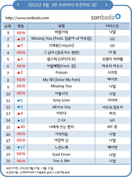 나얼의 첫번째 솔로 정규 1집 '프린시플 오브 마이 소울' 타이틀곡 '바람기억'은 9월 3주차(17일~23일) 소리바다 주간차트 1위를 차지했다. 또 수록곡 '미씽유' '이별시작' '기억리듬' '여전히 난' '소울 피버' '유앤미' 등 총 7곡이 20위권 안에 안착하며 인기를 과시했다.