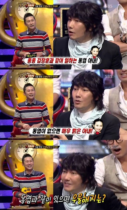 이에 김장훈은 "나는 결혼식장을 가도 결혼하고 싶다는 생각을 안 한다. 그런데 정흥채 씨를 보고 처음으로 결혼하고 싶다는 생각이 들었다"라며 "사실 신동엽 씨 부부를 비롯해 다른 부부들과 같이 만나곤 하면 '꼭 같이 살아야 하나'라는 생각을 가졌다"라고 밝혀 신동엽을 당황하게 했다.