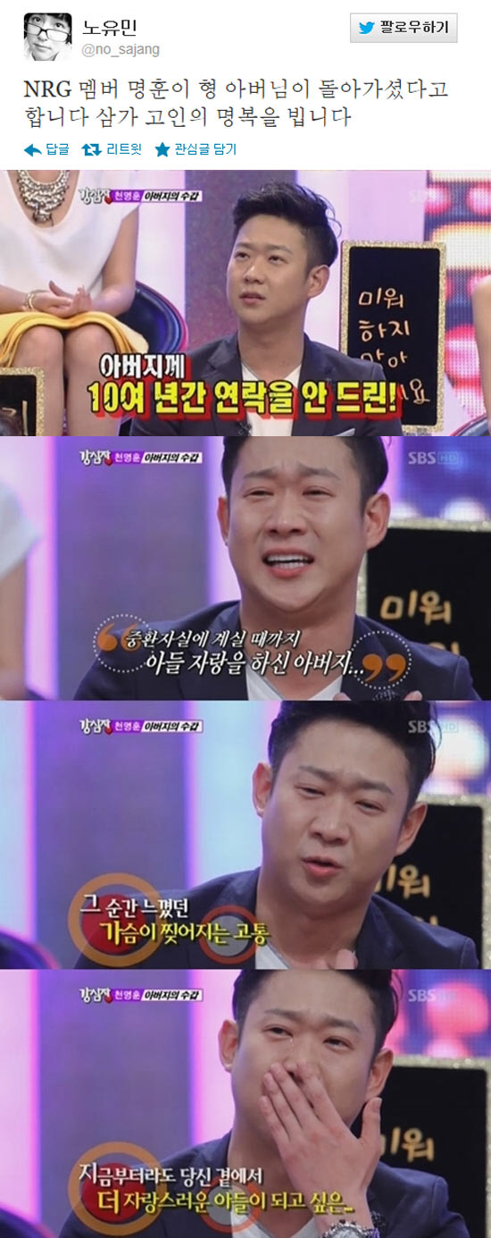 이어 "10여년이라는 시간 동안 나는 아버지를 미워했는데, 아버지는 중환자실에 계실 때 까지 '내 아들이 누군지 알아? 천명훈이야'라고 아들 자랑을 하셨다. 그 순간 가슴이 찢어지는 고통을 느꼈고, 지금부터라도 자랑스러운 아들이 되고 싶다"며 끝내 많은 눈물을 쏟아내 시청자들의 가슴을 울렸다.