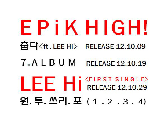이어 10월 19일에는 에픽하이 세 멤버가 뭉쳐 지난 2009년 6집 'e' 이후 3년 만에 새 앨범을 발표한다.