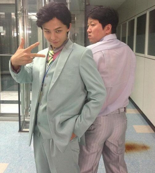 지드래곤은 29일 자신의 트위터에 "난 오늘 무참히 망가진다. 확인할 사람 '무한도전' 본방 사수"라며 사진 한 장을 게재했다. 공개된 사진에서 그는 2:8 가르마를 탄 복고풍 가발을 쓰고 '은갈치' 정장을 입은 모습이다. 지드래곤의 뒤에는 줄무늬 정장 팬츠에 와이셔츠를 입고 그를 응시하는 정형돈의 모습이 담겼다.