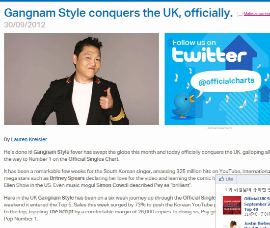 가수 싸이의 '강남 스타일'이 영국(UK) 음악 차트 1위에 오르는 쾌거를 이룩했다.
