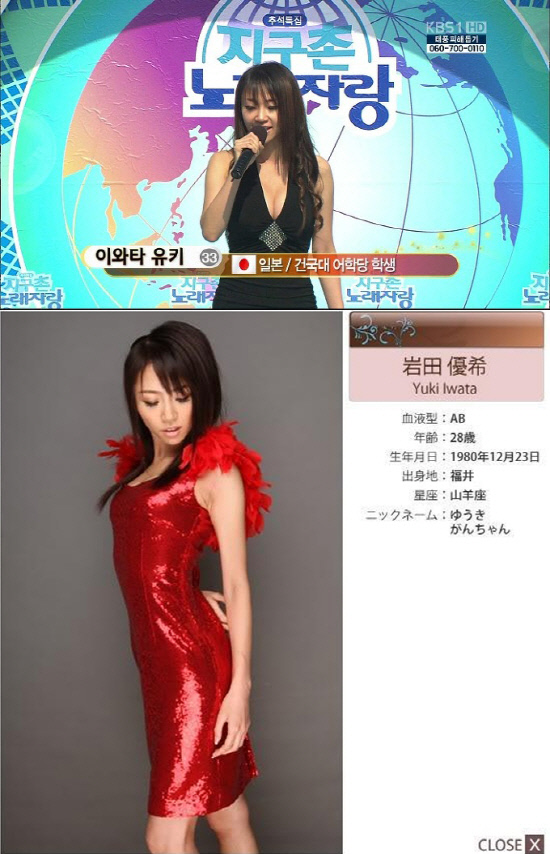 이날 일본 대표로 참가한 이와타 유키(33)는 동명의 일본 가요를 리메이크한 박효신의 '눈의 꽃'을 부르며 일반인답지 않은 노래 솜씨와 미모, 가슴 선을 드러낸 파격적인 원피스, 글래머러스한 몸매로 시선을 한몸에 받았다.