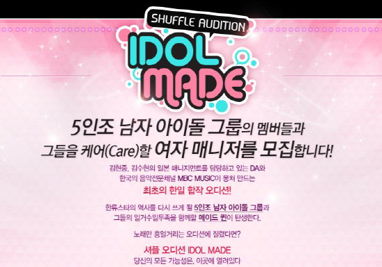 음악 채널 MBC뮤직과 일본의 디지털 어드벤처(이하 D.A), 한국의 키이스트가 함께하는 아이돌 오디션 프로그램 '셔플 오디션 아이돌 메이드'(이하 아이돌 메이드)가 3일 첫 방송된다.