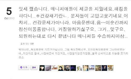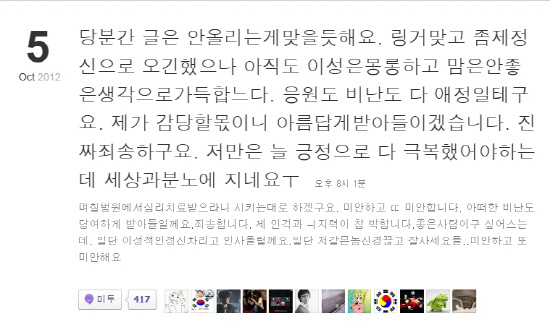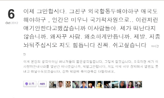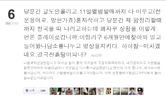 그는 "당분간 글도 안 올리고, 11일 앨범 발매까지 다 미루고. 당분간 마음 정리할 때까지 한국을 떠나려고 하는데 왜 자꾸 상황을 이렇게 언론 플레이로 가나. 이러려고 6개월 만에 찾아왔나"라며 "결국 진흙탕이 되나? 나름 국위선양한답시고, 더 이상 일이 불거지지 않게 조용히 해주마라고. 내가 정리하고 이번 앨범 활동만 마치면 바로 떠날 테니 걱정 말고, 다시 돌아갈 길은 없다고 했는데 이게 뭔가. 왜 자꾸 사람을 몰아가나"라고 글을 올렸다. 루머로 떠돌던 불화설의 실체가 확인된 것.