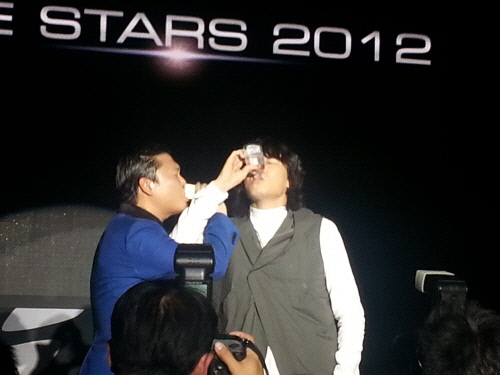 갑작스러운 상황에 싸이는 놀라워하면서도 김장훈의 사과를 받아들이며 화해의 의미로 소주 러브샷을 나눴다. <스포츠조선닷컴, 조선비즈 제공>
