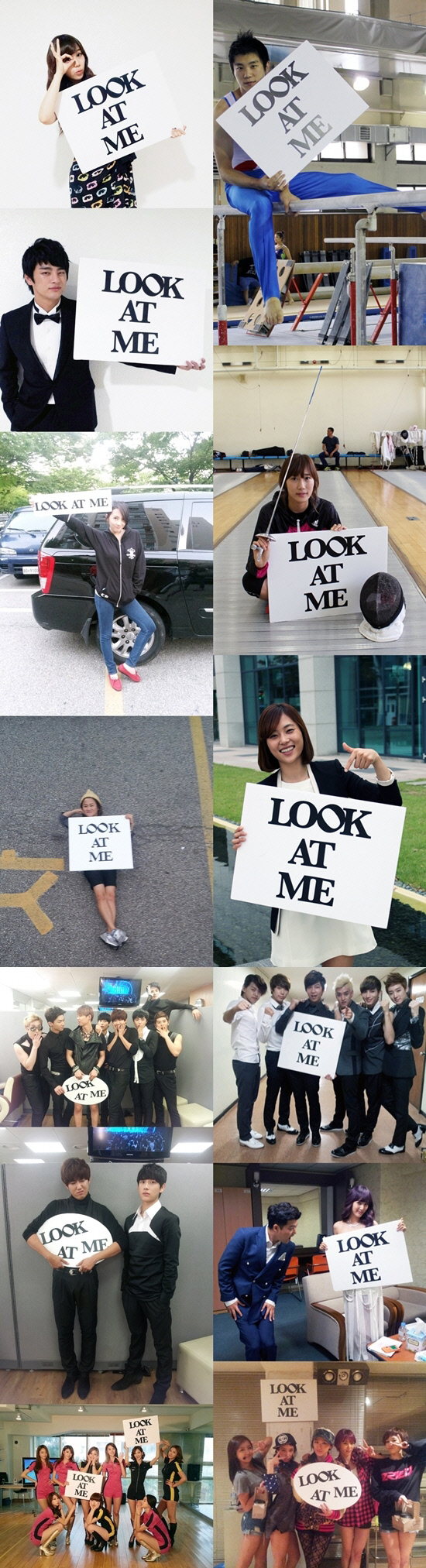 쥬얼리는 11일 새 미니앨범 '룩앳미'로 컴백한다. 이들의 컴백을 위해 tvN '응답하라 1997'의 '응칠커플' 서인국과 에이핑크 정은지, KBS2 '청춘불패' 식구인 김신영, 카라 강지영, 2012 런던 올림픽 여자 펜싱 금메달리스트 김지연, 광저우 아시안 게임 펜싱 금메달리스트 전희숙, 체조선수 김지훈 까지 '룩앳미'라는 문구가 새겨진 팻말을 들고 응원을 보냈다. 또 프리랜서를 선언한 아나운서 전현무, EXID 엘리, 유키스, 한솥밥을 먹고 있는 제국의아이들과 나인뮤지스도 응원 행렬에 동참했다.