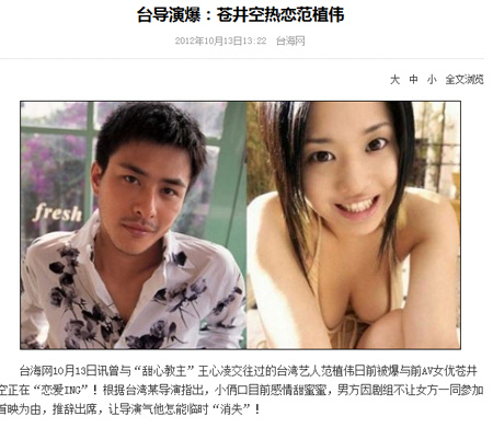 일본 AV배우 아오이 소라(29·蒼井そら)와 대만 배우 판즈웨이(32·範植偉)가 열애설에 휘말렸다.