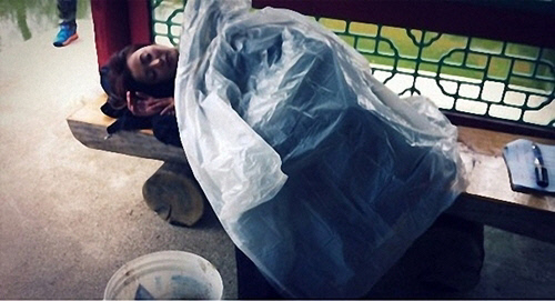 해당 사진은 드라마 스태프가 몰래 찍은 것으로 김희선은 통나무 벤치에 누워 비닐을 덮은 채 곤하게 자고 있는 모습. 쌀쌀해진 날씨 때문에 모포 대신 비닐 우비를 덮고 자는 김희선은 하필이면 쓰레기통 바로 옆 나무 벤치에 누워 있어 '꽃거지'를 연상케 했다. 김희선의 발 밑에는 대본과 필기도구가 놓여 있어 대본을 읽다가 지쳐서 잠든 것으로 보인다.