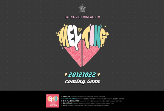 17일 현아의 새 앨범 '멜팅' 트랙리스트가 공개됐다. 여기엔 현아의 첫 자작곡인 '베리 핫'이 포함돼 있어 눈길을 끈다. '베리 핫'은 현아와 절친 리원이 함께 작업한 곡으로, 무대 뒤 평범한 자신의 모습을 위트있게 그려낸 가사와 감각적인 멜로디가 인상적이다. 또 솔로 앨범에 임하는 자세를 노래한 랩 솔로곡 '흐트러지지 마', 비투비 정일훈이 랩 메이킹에 참여한 틴팝 장르의 '풋사과', 현아가 가사 작업에 참여한 '내 남자친구에게' 등이 담겼다.
