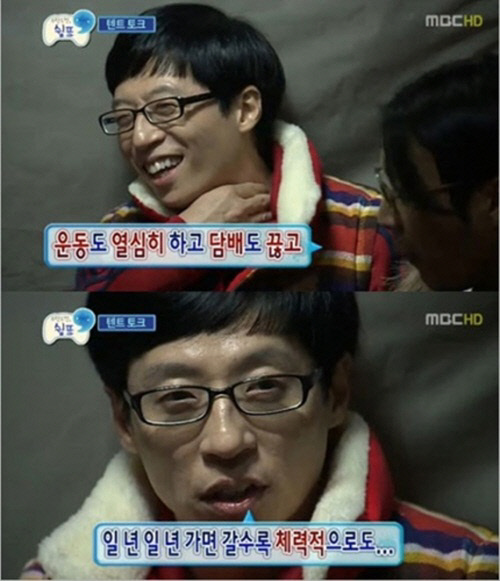 20일 방송된 MBC '무한도전' 300회 '쉼표특집'에서 멤버들과 속이야기를 나누던 유재석은 "내가 좋아하는 무언가를 포기하지 않으면 두개를 가질 수 없다"고 말문을 열었다. 그는 "가면 갈수록 체력적으로도 힘들다"면서 "대비하지 않고 준비하지 않으면 안 된다"고 말했다. 이어 "예전처럼 일을 해낼 수 없고, 추격전 때도 숨이 차고 버겁다. 아슬아슬하게 하려면 내가 그 사람만큼 아슬아슬하게 잡아야 하니까 내가 담배를 좋아해도 끊어야 하고 운동도 열심히 해야 한다"고 말했다.