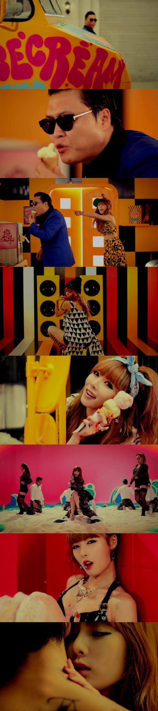 '아이스크림'의 뮤직비디오는 국제가수 싸이의 카메오 등장으로 시작해 눈길을 끈다. 현아가 싸이의 '강남 스타일' 뮤직비디오에 출연한 것에 대한 보답 차원으로 싸이가 등장한 것으로 전해졌다. 싸이는 현아의 아이스크림 트럭에 잠입, 아이스크림을 먹다가 현아와 티격태격하는 코믹연기를 재치 있게 소화해 웃음을 자아낸다.
