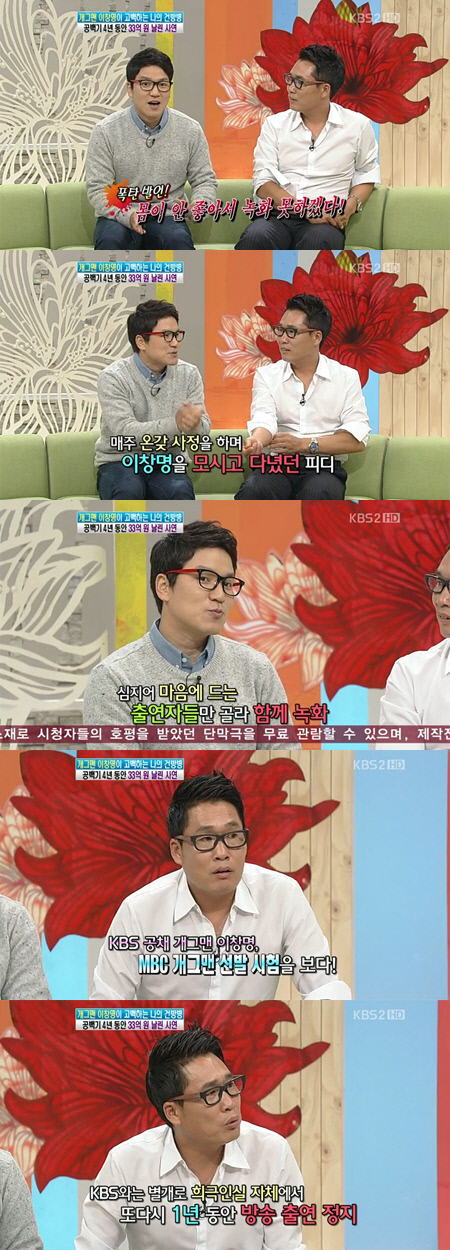 그는 "방송 출연 정지를 당한 후 이대로 안 되겠다는 생각에 KBS 공채 개그맨인데도 MBC 개그맨 콘테스트를 나갔다가 선배들에게 발각돼 어마어마하게 혼났다"며 "이후 KBS와는 별개로 희극인실 자체에서 또다시 1년 동안 방송 출연 정지를 당했다"며 파란만장한 인생을 고백했다. <스포츠조선닷컴>