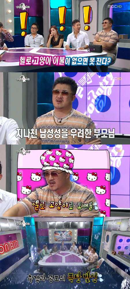 그는 "남성성이 너무 세니까 부모님이 걱정을 하셨다. 결국 어머니가 '남성성을 죽여야한다'며 나도 모르게 방에 헬로 고양이 침구세트와 안대, 슬리퍼까지 마련해주셨다"고 말해 웃음을 자아냈다. 여기에 마치 데프콘이 실제로 이불을 덮고 자는 것처럼 '라디오스타' 특유의 깨알 같은 CG가 덧입혀져 폭소를 유발했다.