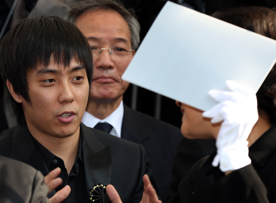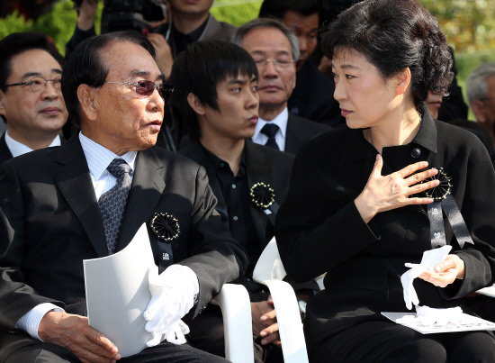 새누리당 박근혜 대선후보가 26일 오전 서울 동작구 국립현충원에서 열린 고(故) 박정희 전 대통령의 33주기 추도식에 참석, 5촌 조카인 가수 은지원과 대화를 나누고 있다. 박 후보 옆에 앉은 은희만씨는 박 전 대통령 누나인 박귀희씨의 아들이자 은지원의 아버지다.[연합뉴스]