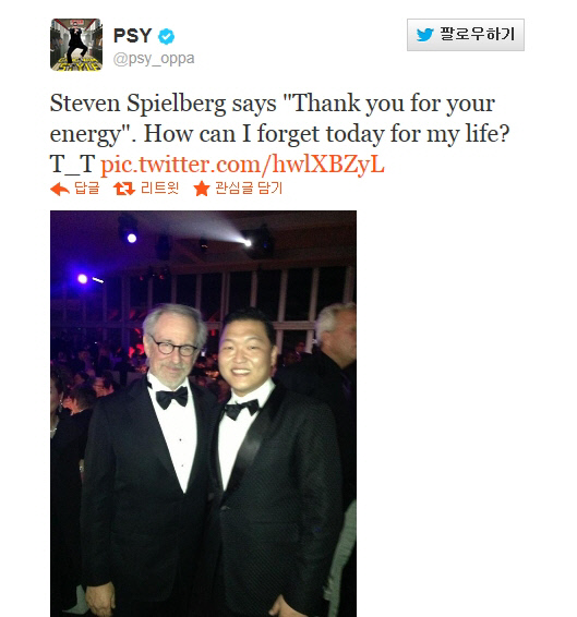 싸이는 28일 자신의 트위터에 "스티븐 스필버그가 '당신의 에너지가 고맙다'고 했다. 어떻게 내 인생에서 오늘을 잊을 수 있을까"라며 사진 한 장을 게재했다. 공개된 사진에서 싸이와 스티븐 스필버그는 말쑥한 수트 차림으로 나란히 서서 환한 미소를 짓고 있다. 네티즌들은 '이젠 스티븐 스필버그까지' '싸이 정말 국제가수 맞네'라는 등 뜨거운 반응을 보였다.