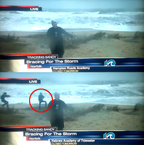"정말 심각하다. 비바람이 거세지면서 해안은 분간할 수도 없다"면서 리포터가 위급한 상황을 알린다. 그런데 잠시 후 리포터 뒤로 두 명의 시민이 나타나 카메라를 향해 신나게 말춤을 춘다. TV 화면을 찍던 게시물 게시자도 키득키득 거리다 웃음을 터뜨리고 만다.