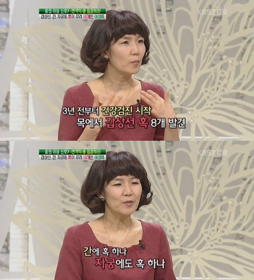 2일 오전 방송된 KBS 2TV '여유만만'에 출연한 이성미는 갑상선, 간, 자궁에 혹이 무려 10개인 사실을 털어놨다.