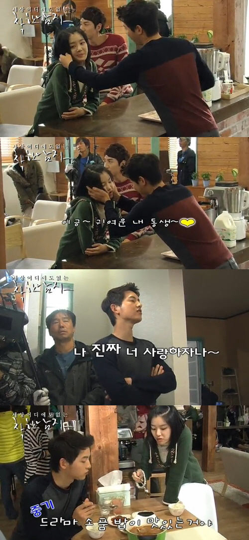 특히 눈길을 끄는 것은 극 중 사이좋은 남매로 호흡을 맞추고 있는 송중기와 이유비의 다정한 모습. 송중기는 촬영 중간 중간 이유비의 볼을 양손으로 감싸며 장난을 치고, 과자와 소품용 음식을 나눠 먹는가 하면 "내가 진짜 너 사랑하잖아"라고 이유비를 향한 애정을 거침없이 드러내 시선을 모은다.