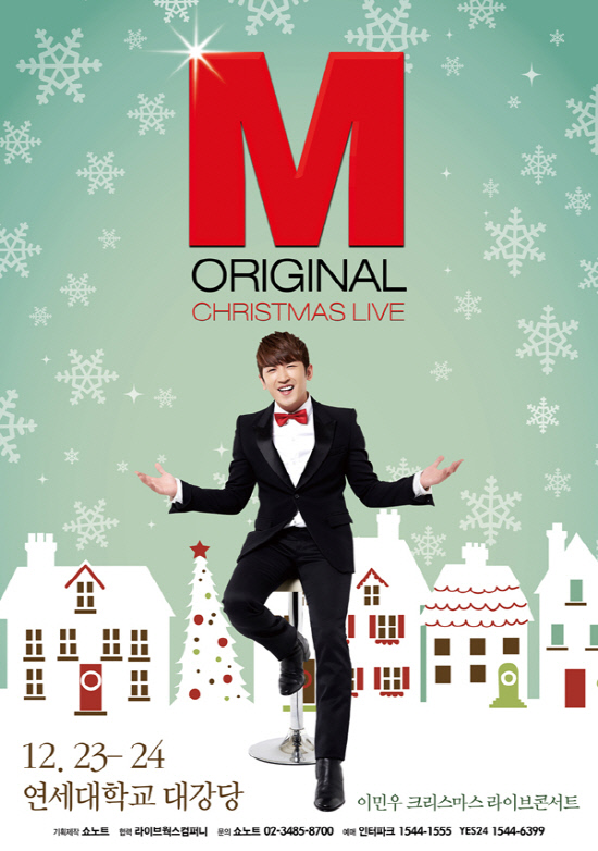 한편 오는 12월 23일과 24일 연세대학교 대강당에서 열리는 이민우의 크리스마스 단독 라이브 콘서트 'M 이민우 Christmas Live Concert-ORIGINAL'은 화려한 퍼포먼스 무대는 물론, 추운 겨울 마음을 따뜻하게 녹여줄 라이브 공연으로 2012년 크리스마스에 특별한 선물과 같은 명품 무대를 선사할 예정이다.