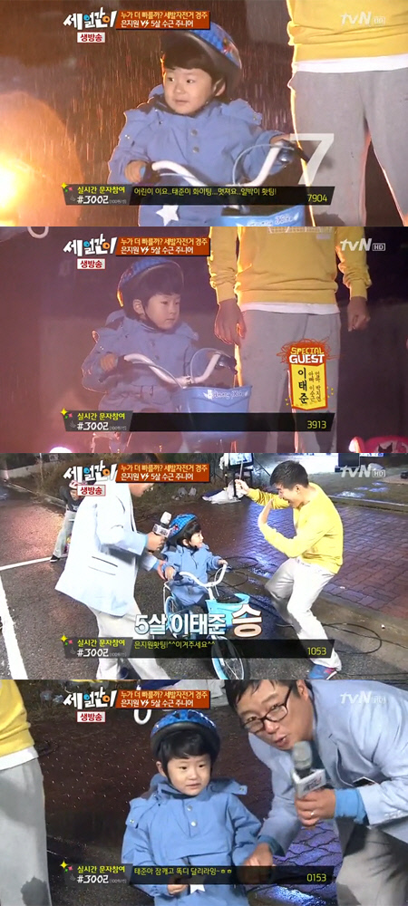 엄마를 빼닮은 깜찍한 외모를 자랑한 태준 군은 비가 오는 상황에서도 열심히 게임에 임해 은지원과의 경주에서 승리했다.