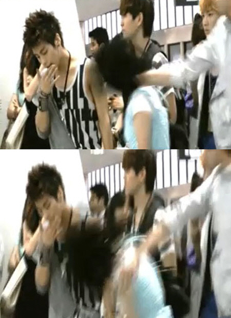 이를 발견한 매니저는 순식간에 손으로 안경을 낀 여학생 팬의 머리를 세게 때렸다. 결국 안경이 벗겨지며 날라가기까지 한 여학생은 두 손으로 얼굴을 감싼 채로 물러섰다.
