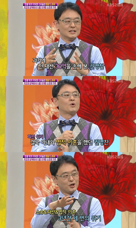 권영찬은 "30억이 작은 건 아니지만 돈은 다시 벌면 되겠지 생각했는데 제일 힘들었던 건 아내와 법적 이혼을 했다는 것이다"라고 밝혀 놀라움을 샀다.