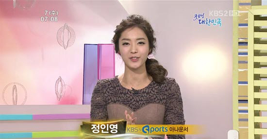 사진은 7일 오전 방송한 KBS 2TV 아침 교양 프로그램 '굿모닝 대한민국'에 출연한 정인영 아나운서의 방송 화면을 캡쳐한 것.