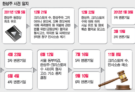 이어진 법정공방도 진흙탕 싸움이었다. 한성주 측은 지난 해 3월 사건 당시 크리스토퍼 수와 함께 있었다는 사실과 홍콩으로 출국하는 크리스토퍼 수와 인천공항까지 동행했다는 사실은 인정했다. 그러나 "폭행을 당했다"는 크리스토퍼 수의 주장에 대해서는 부인했다. 결정적인 증거 없이 주장과 반박만 반복되는 와중에도 사건의 당사자인 한성주와 크리스토퍼 수는 뒤에 숨어서 끝까지 모습을 드러내지 않았다. 그런 가운데 형사 사건을 담당한 서울 동부지검은 양측의 맞고소 건에 대해 기소중지를 내렸다. 크리스토퍼 수의 행방이 불분명한 데다 검찰의 출석 요구에 불응하고 있어 조사 진행이 불가능하다는 이유 때문이다. 결국 형사소송과는 별도로 5억원의 피해보상에 대한 민사소송만이 지루한 법정싸움을 이어갔다.