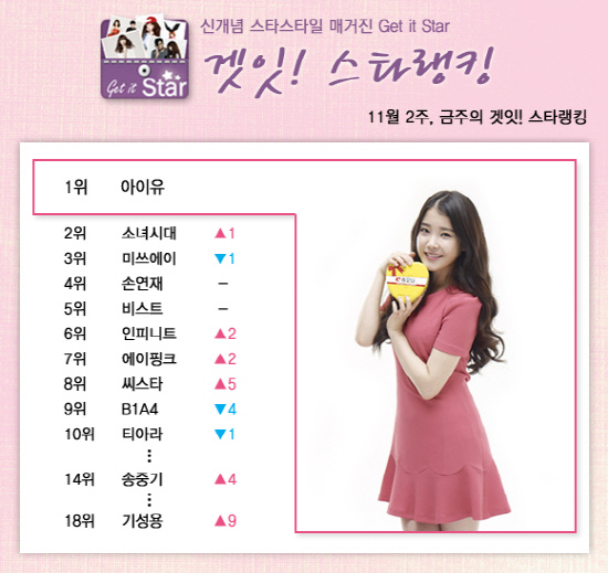 금주는 레모나 팬사인회로 수많은 인파를 몰고 다닌 '대세' 아이유가 1위에 등극! 한일을 넘나들며 오빠 & 삼촌팬들의 열렬한 지지를 받고 있는 소녀시대, '남자 없이 잘 살아'로 돌아온 미쓰에이가 뒤를 잇고 있습니다.