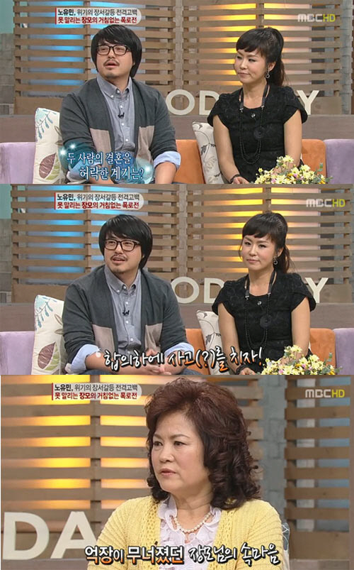 그러나 함께 출연한 노유민의 장모 김연금 씨는 "그러면 뱃속에 태아가 다 듣고 있는데 어떻게 하냐. 속으로는 억장이 무너지면서 딸이 미워 죽겠더라. 노 서방은 나잇살이나 먹어가지고 철이 없어서 그렇다 치더라도..."라며 속내를 털어놨다.