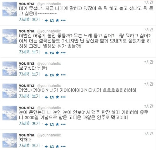 윤하는 14일 자신의 트위터에 "치해떠. 눈이 온댔는데 내 눈엔 눈이 안 보여서 맥주 한 잔 해떠. 키히히히 좋쿠나. 3000일 기념으로 받은 고마운 과일은 안주로 먹고 이떠. 기엽냐 기여어? 내가 기여어어어어? 따시가 호호호호히히히히. 보구싯다 님들!"이라며 "이번엔 어떻게 놀면 좋을까? 무슨 노래 듣고 싶어? 나랑 뭐하고 싶어? 이제 더는 깜짝 선물도 아니지만 난 당신과 함께 보내기로 정했지롱 히히히 그러니 말해봐 뭐가 좋을까? 머가 무섭냐. 지금 너에게 말하고 있잖아. 흑. 뭐하고 놀고 싶냐고 뭐 듣고 싶은데~~"라는 멘션을 게재했다.