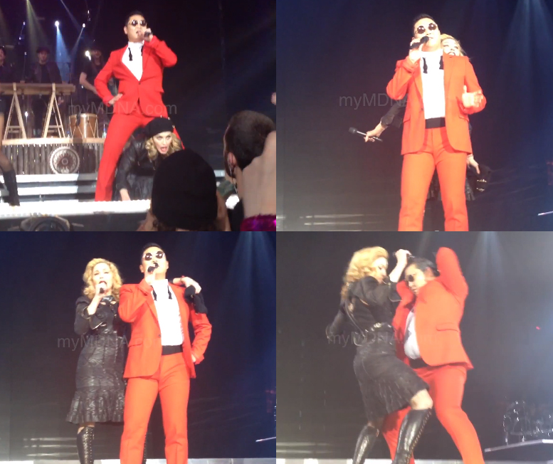 이날 마돈나는 2008년 히트곡 '기브 잇 투미(Give It 2 Me)'에 '강남스타일'을 리믹스한 곡을 선보이던 도중 갑자기 싸이를 소개했고, 무대 중앙에서 싸이가 나타나며 2만여 관객을 흥분시켰다.