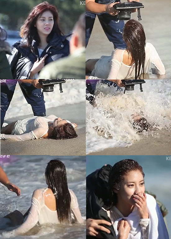특히 촬영 중 덮친 파도에 물에 젖어 완벽하게 드러난 그녀의 실루엣에 시청자들의 눈길이 머물렀다. 또 손담비는 심한 파도에 코와 입에 물이 들어가는 고통 속에도 추위와 싸우며 투혼을 발휘하고 있어 프로정신을 드러냈다.