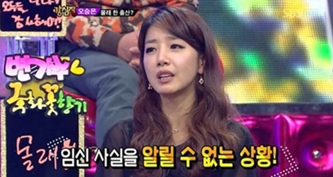 20일 방송된 SBS '강심장'에서 오승은은 "결혼한 지 3년 됐다. 큰 아이는 네 살, 둘째는 두 살이다. 결혼 당시에는 임신 사실을 알릴 수 없었다. 지금의 남편과 연애하던 시절 헤어진 적이 있다. 헤어지고 나서 임신 사실을 알게됐다. 당시엔 드라마 촬영 중이었고 소속사 입장도 있어서 알릴 수 없었다. 힘들고 스트레스 받아 촬영 중 실신까지 했다. 혼자 아파 끙끙 앓았고 엄마도 신랑도 못 알아봤다. 8개월까지 임신 사실을 숨겼다. 혼자 낳을까 생각도 했지만 코디가 남편에게 전화했다. 남편은 한 걸음에 달려와 무릎꿇고 사죄한 뒤 프러포즈 했다"고 밝혔다.
