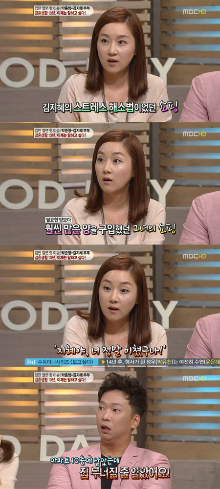 김지혜는 21일 방송된 MBC '기분 좋은 날'에 출연해 "나의 스트레스 해소법은 쇼핑이었던 것 같다"고 털어놨다.