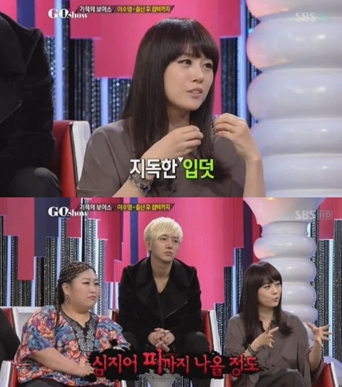 이수영은 23일 방송된 SBS '고쇼'에 출연, "임신 초기 MBC '나는 가수다'에서 섭외 전화를 받았다. 뱃속 아기와 열창하는 순간을 꿈꿨는데 입덧이 너무 심해 매일 피를 토했다. 임신 6개월이 될 때까지 먹지도 못 하고 온 몸이 타는 듯한 고통을 느꼈다. 거의 만신창의 수준이었다. 라디오 진행도 겨우 이어갔다. 무대를 볼 때마다 심장이 뛰었지만 무대에 오를 수 없었다. 안타까움만 커졌다. 당시 굉장히 우울했다"고 밝혔다. 이어 "철저한 자기 관리 끝에 '나는 가수다'에서 우승할 수 있었다. 말로 표현할 수 없을 정도로 기뻤다"고 전했다.