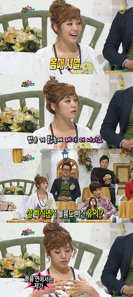 리지의 답에 다른 출연자들이 유이를 언급하며 "유이가 꿀벅지에 몸매가 좋지 않느냐"고 물었다.