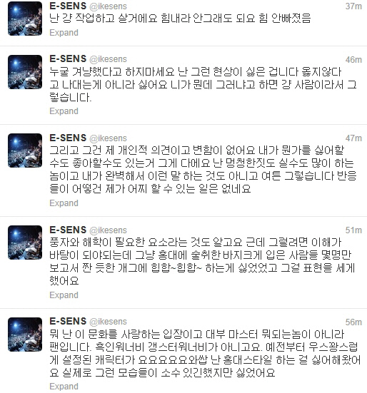 이센스는 27일 자신의 트위터에 "난 이 문화를 사랑하는 입장이다. 대부 마스터, 뭐 되는 놈이 아니라 팬이다. 흑인 워너비, 갱스터 워너비가 아니다. 예전부터 우스꽝스럽게 설정된 캐릭터가 '요요요요요요와쌉 난 홍대스타일'하는 걸 싫어해왔다. 실제로 그런 모습들이 소수 있긴 했지만 싫었다. 풍자와 해학이 필요한 요소라는 건 안다. 그런데 이해가 바탕이 되어야 하는데 그냥 홍대에 술 취한, 바지 크게 입은 사람 몇 명만 보고 짠 듯한 개그에 힙합~힙합 하는게 싫었다. 그걸 세게 표현했다"는 글을 게재했다.